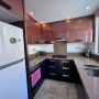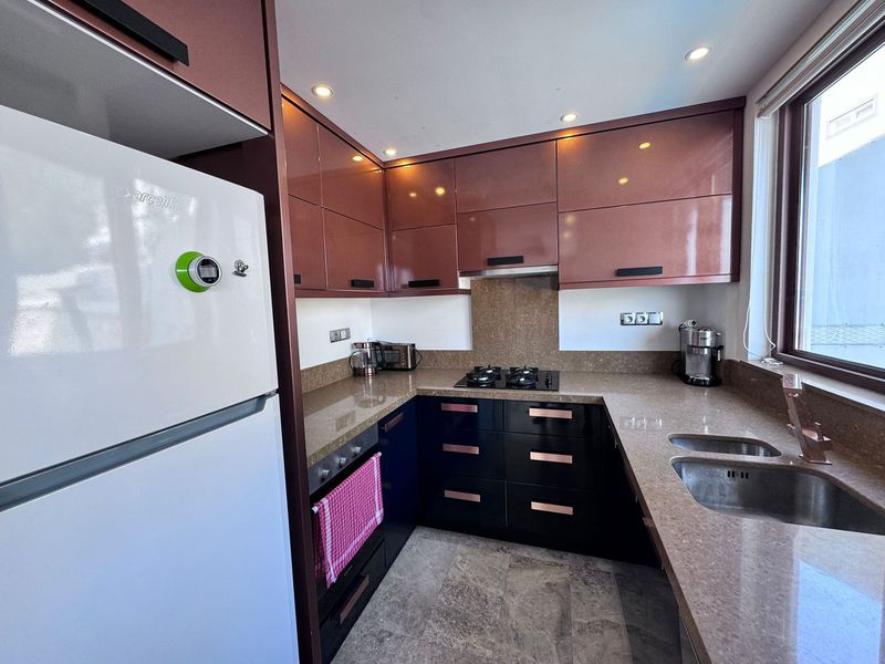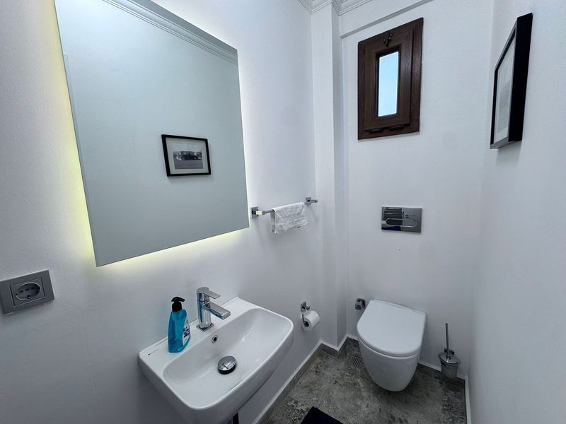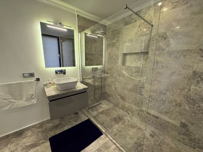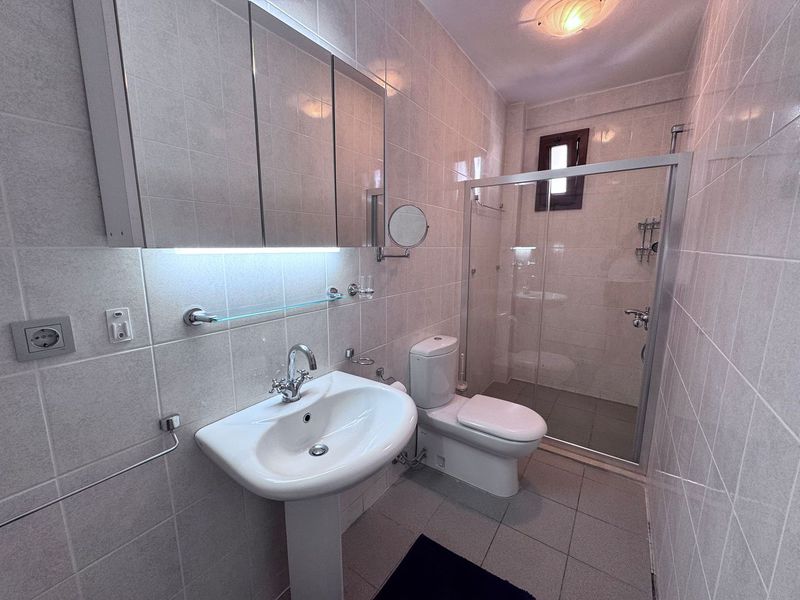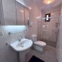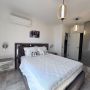 The second bedroom is a smaller double with a built-in wardrobe with drawers below, two bedside tables and an en-suite shower with WC and basin. There is also a glass door with access to a private balcony with partial sea views.