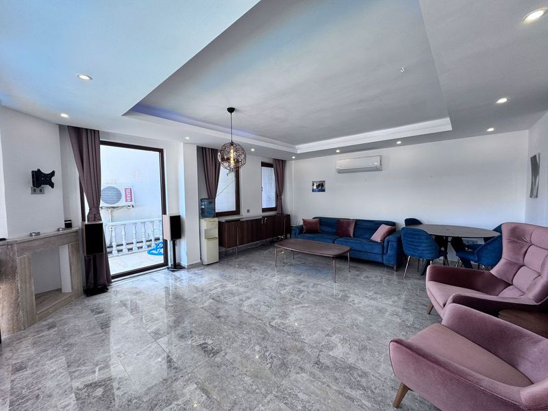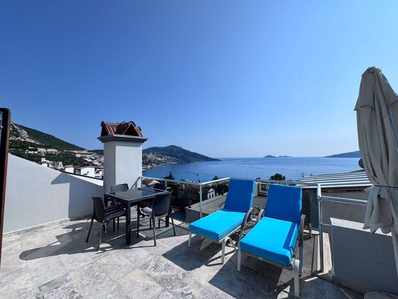 A glass door opens onto the roof terrace which has two sun loungers, a parasol and a small dining table with 4 chairs - the perfect place to enjoy the views across Kalkan Bay out to the islands.